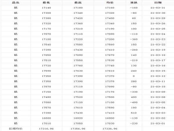 三月的鋁錠價(jià)我們從圖五可以看出來(lái),好比就是過(guò)山車(chē),波動(dòng)很大,但是區(qū)間價(jià)格依然不低于一萬(wàn)七千多,從圖六可以看出每天數(shù)在皆在17000元/噸左右,這也元的價(jià)格在17316.96-17356.96元/噸,日均價(jià)在17336.96元/噸,這時(shí)候很鋁型材廠家開(kāi)始調(diào)整價(jià)格了,因?yàn)楦?dòng)太大,按照原本的價(jià)格出售,廠家也承受不起了。以上是對(duì)2021年這一個(gè)季度的鋁型材價(jià)格做了簡(jiǎn)單介紹,希望文中內(nèi)容能幫得到大家。上海啟域?qū)I(yè)生產(chǎn)型材及配件,30000平方米生產(chǎn)基地,型材規(guī)格全,年生產(chǎn)量高達(dá)20000余噸,單獨(dú)材料可直接發(fā)貨,廠家擁有數(shù)10套加工設(shè)備,加工精度高,工廠嚴(yán)格執(zhí)行IS9001質(zhì)量管理認(rèn)證標(biāo)準(zhǔn),合作企業(yè)5000+,歡迎咨詢。