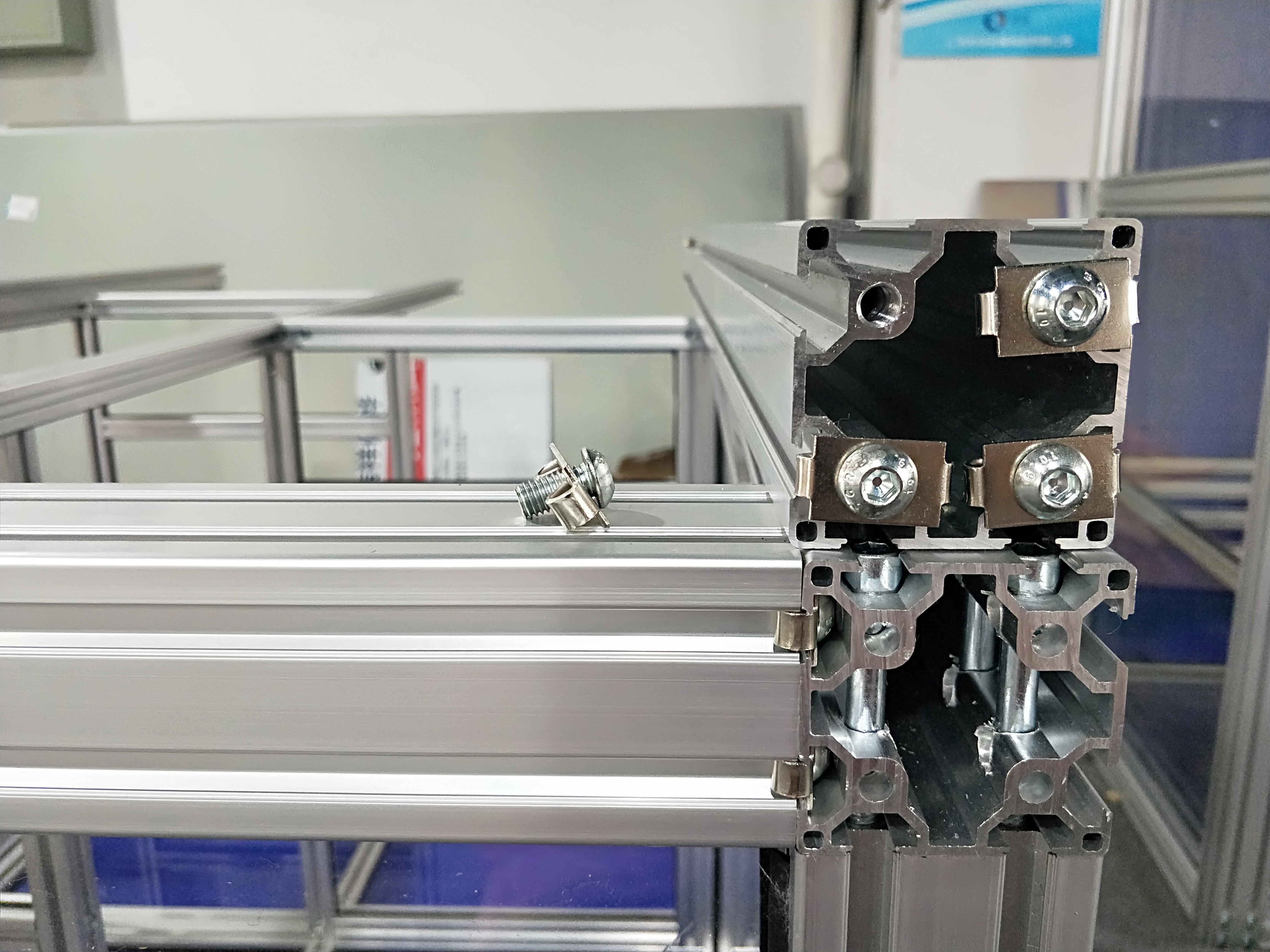 從圖中可以看,三根型材垂直連接需要用到彈性扣件,專用半圓頭螺栓,內(nèi)六角螺栓三種配件。其中彈性扣件和半圓頭螺栓是搭配使用的。在連接前,需要在型材上打安裝孔,包括沉頭孔,攻牙孔,通孔三種。三根型材中有一根型材四面皆是需要打孔的,安裝內(nèi)六角螺栓的沉頭孔和扳手固定的通孔。另兩個根型材是需要在截面處攻牙,用來咨詢內(nèi)六角螺栓和半圓頭螺栓。安裝方法如上圖中看到的,先用彈性扣件和半圓頭螺栓把一根型材固定在另一根型材上。然后用內(nèi)六角螺栓把這兩根型材固定在剩下的一根型材上就可以了。這個安裝方法,是隱藏在型材內(nèi)的,外觀上比較美觀。使用此方法比較便于安裝面板,所以是常用于工作臺,設(shè)備防護(hù)罩,機(jī)箱機(jī)柜的定制。